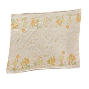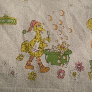 Vintage, cotton baby, toddler, receiving blanket featuring Big Bird from Sesame Street. Multicolor, yellow, orange and green graphics. I found a similar blanket with the tag still attached indicating Toddletime is the maker and the fabric is 100% cotton. The colors have faded and aren't as vibrant as they once were. The blanket measures approximately 31x26 inches. In good pre-owned vintage condition.
