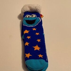 Cozy Non-Slip blue sherpa socks featuring Sesame Street characters Cookie Monster & Elmo.