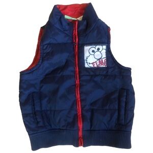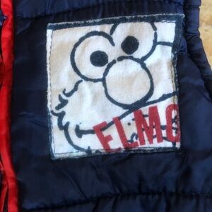 A cute and hard to find, Elmo puffer vest! Navy blue on the outside; red on the inside; a pocket on each side; a small Elmo logo on the front chest; a large Elmo NY portrait and Sesame Street scene on the back.