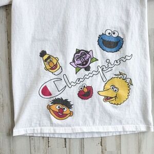 Champion X Sesame Street collab T-shirt, adult size Small. This runs on the NARROW side, so please check measurements! Cute Sesame Street graphics all over. Some very faint spots on back, please see last few pics. Haven't tried to remove. Other than that, this shows just some normal wash wear. White is still bright. 100% cotton.