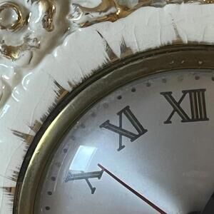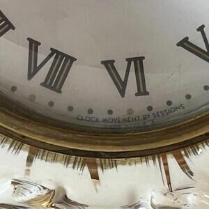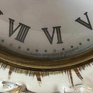 The Sessions Mantle Clock is a vintage 10" electric clock made of ceramic with a floral embossed design. Featuring a plug-in quartz movement, this Victorian-style clock has Roman numerals for easy timekeeping. The gold finish adds a touch of elegance to any decor, making it a charming addition to any collection of decorative collectibles. Made in the United States by the renowned brand Sessions, this analog clock will surely be a focal point in any room with its unique and classic appeal.