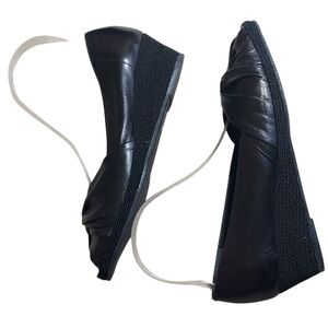 These Sesto Meucci flats feature a sleek black leather-like material with a stylish pleated design across the toe. The rounded toe and low wedge heel offer both comfort and a touch of elegance, making them perfect for any occasion.