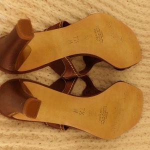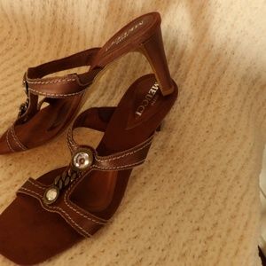 Sesto SUEDE sandals with 2-1/2 inch heel, jeweled and chain on vamp, suede insole with Sesto Logo imprinted, leather cushion pad and leather bottoms.