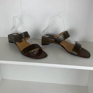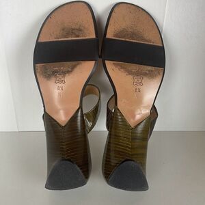 Additional Details: Funky sculptural block heels, brown color with olive green undertones in certain lighting