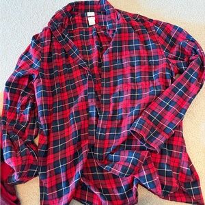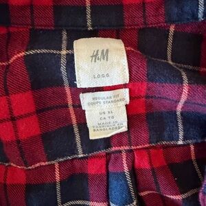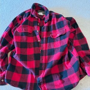Buffalo plaid flannel in red and black. Button-front with chest pocket styling. Cozy, soft fabric for layering. Casual outdoor aesthetic.