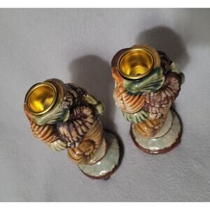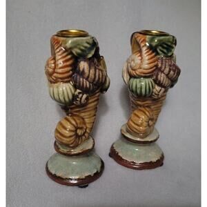 Set 2 Cornucopia Candle Stick Holder Thanksgiving Ceramic Hand Painted Signed