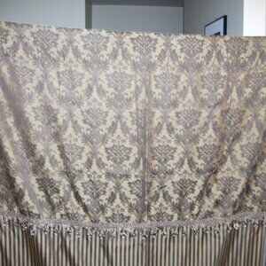 Set of two full length gorgeous curtain panel drapes. Each panel is approximately 84" inches long and 53.5 inches wide. Fabric has a classic floral motif on top third, tassels, and vertical stripes on the bottom.