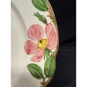 This set of 2 Franciscan Desert Rose 10.25 pink floral round dinner plates features a charming hand-painted design in a multicolor floral pattern. Made of ceramic with a glossy finish, these mid-century modern plates are not only decorative but also oven and microwave safe for easy use. The plates are marked with a printed backstamp and are vintage pieces produced in the United States, adding a touch of nostalgia to your table setting. Perfect for serving meals with style and flair, these dinner plates are a lovely addition to any home. Please note- these are pre-owned but in very good condition. Very minor scratching. Aside from that theres no chips or cracks. Please make sure to look at pics closely. Thanks for looking!
