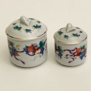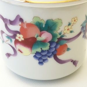 beautiful decorative painted ceramic/porcelain jar with images of fruit and vines