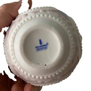 A charming pair of vintage porcelain Christmas ornaments designed by Lladro showcasing festive embossed details and pastel ribbons.