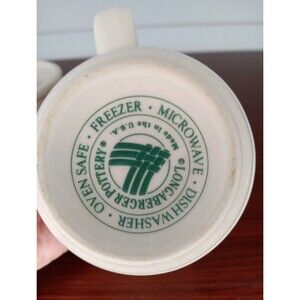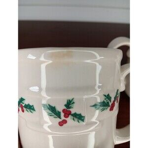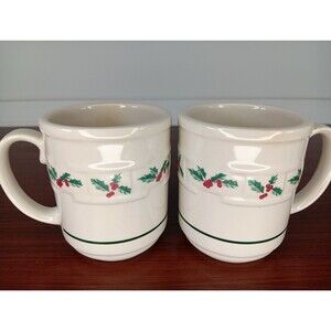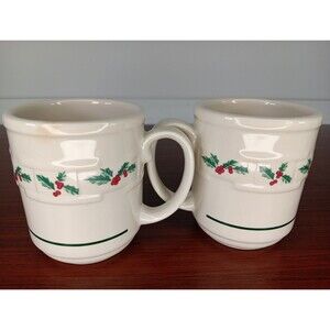 SEE PICS FOR CONDITION...SOME STAINING. This set of two Longaberger Pottery USA Woven Traditions coffee mugs features a holly and berry pattern, perfect for the Christmas and winter seasons. Made of stoneware and ceramic, these round mugs have a capacity of 12 ounces and stand at 4 inches tall. The mugs come in a multicolor design with a contemporary style and are decorated with a handle for easy carrying. Handmade in the United States, these original coffee mugs are a beautiful addition to any home for holiday gatherings or everyday use.