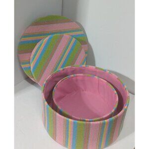 Set/ 2 Nesting Boxes Fabric Covered Round Stripe Pink Lime Aqua Yellow
