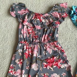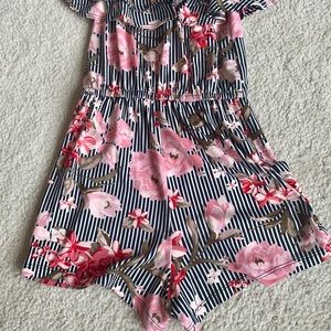 1-striped (black and white) and floral shorts romper with elastic ruffle neck and waist
