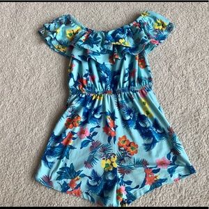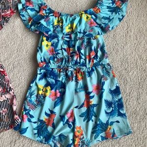 1-turquoise and floral shorts romper with elastic ruffle neck and waist