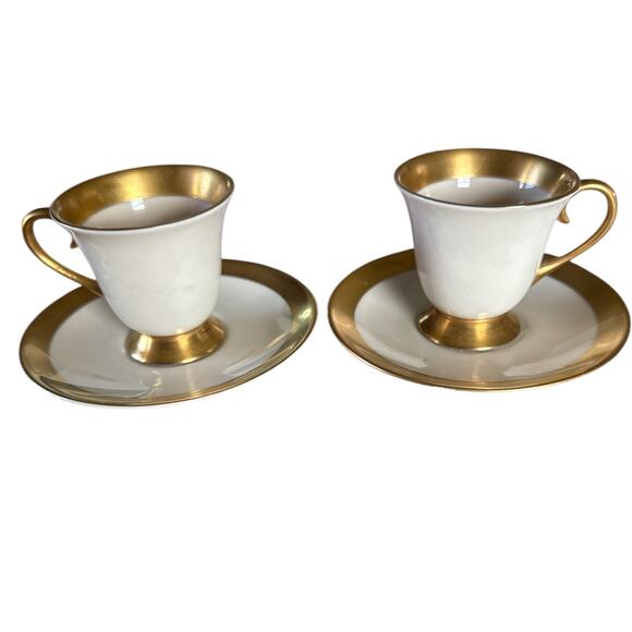 Set (2) Vintage Flintridge Expresso Coffee Cup & Saucer Bone White with Matte Gold Trim.