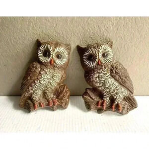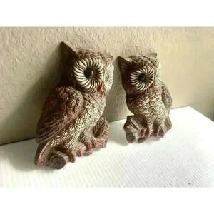 Vintage Owl Wall Hanging Decor MCM Foam Resin 70s Brown Orange 2pc 7” Tall