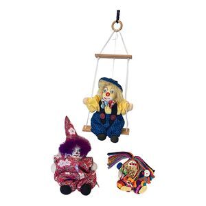 Set (3) CLOWN FIGURINES 8.5" Wooden Swing Ceramic & Wood Heads Cloth Body Yarn +