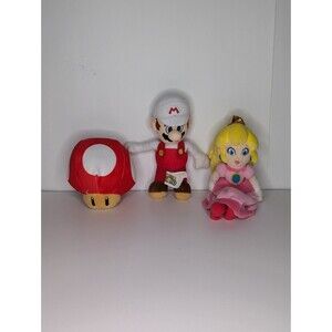 The product is a set of three Super Nintendo Mario plush toys, including a white hat, red fire, and Princess Peach mushroom. These plush toys are suitable for unisex use and are part of the Super Mario Bros. franchise. The items are made of plush material and stand at a height of 8 inches, featuring characters from the Super Mario series like Mario and Princess Peach. The plush toys are an original licensed reproduction from the year 2020 and come from the brand Good Stuff. Perfect for fans of the cartoon and TV character-themed toys.
