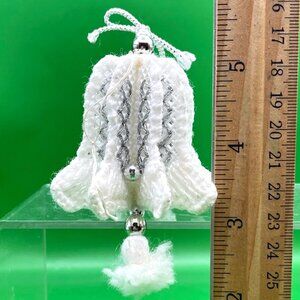 Set of 3 charming vintage hand-crochet bell ornaments, lovingly made by my grandmother in the 1980s. Each ornament is crafted in white yarn over plastic canvas, accented with silver metallic thread and beads, and measures about 3.5–4" tall (see photos with ruler for scale). Perfect for classic Christmas trees, holiday gift wrapping, or year-round vintage decor.