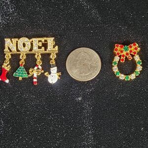 2. Rhinestone "Noel" pin featuring dangling Christmas themed items. This is the largest piece and is approx 1.5" w x 1.25" h.