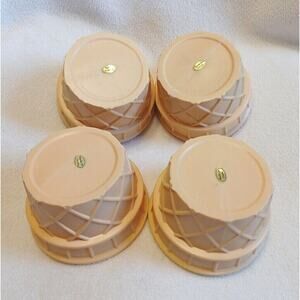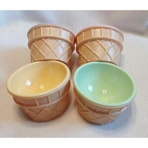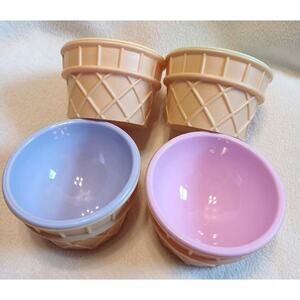 4 dessert bowls & 4 matching spoons. They are plastic &d made to look like ice cream cones. They come in pastel colors: Yellow, purple, pink, & green. They are JSNY brand & manufactured in China. NOT dishwasher or microwave safe. The bowls measure approximately 2 1/2" tall w/a depth of approximately 2" & just shy of 4" wide across the top. The spoons measure approximately 5" long. This set of 8 is brand new. The spoons are still wrapped in the original plastic & the bowls still have tissue paper separating them to keep them from scratching each other. They would be super fun for a party this summer. What you see is what you get, so look at the pictures and judge for yourself. I want all my buyers to be satisfied customers. Comes from a smoke-free home. I try to be as honest as possible while describing the condition of my items. You are buying this item(s) AS-IS. Please look carefully at all pictures as they are part of the condition description and ask any questions before purchasing.
