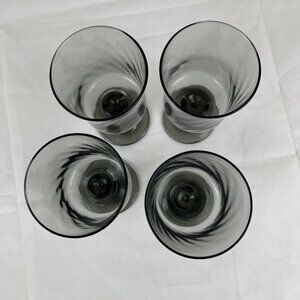 Set of 4 vintage Libbey smoke grey swirl optic tall water goblets or wine glasses.