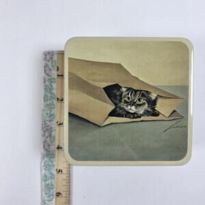 This product is a set of four vintage 1982 Lowell Herrero cat-themed nesting tins made by Vandor in Japan. These tins are made of tin and feature various cat motifs, making them ideal for cat lovers and collectors. The tins are not handmade and are authentic pieces from Japan, adding to their uniqueness and appeal to collectors of cat-themed items.