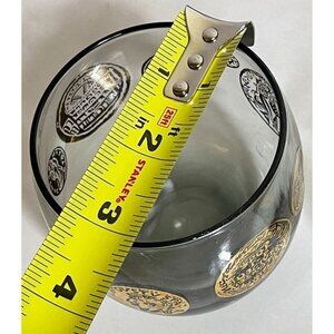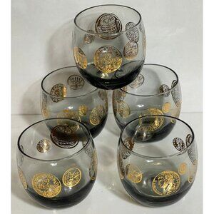 Set 5 Roly Poly Cocktail Roman Coins Mid Century Gold Smoky Glass Round Barware