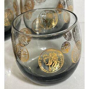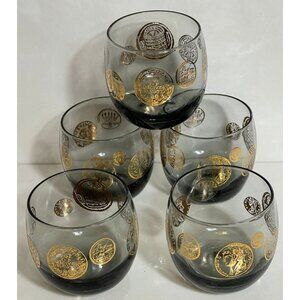 Beautiful set of 5 roly-poly glasses in the Roman Coins pattern by Federal Glass feature old Roman coins in gold on a smoky glass background.