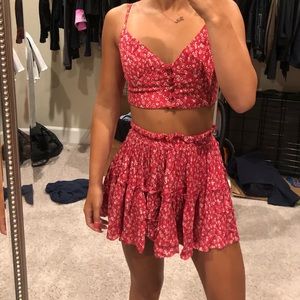 This adorable reddish pinkish set is a size 0 never worn. It is a skirt with a crop top.
