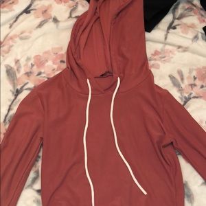 Sweater has a hoodie.