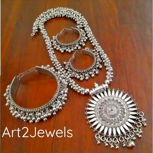 sun pendant with metal bead chain, bangle and hoop earring . oxidised silver tone