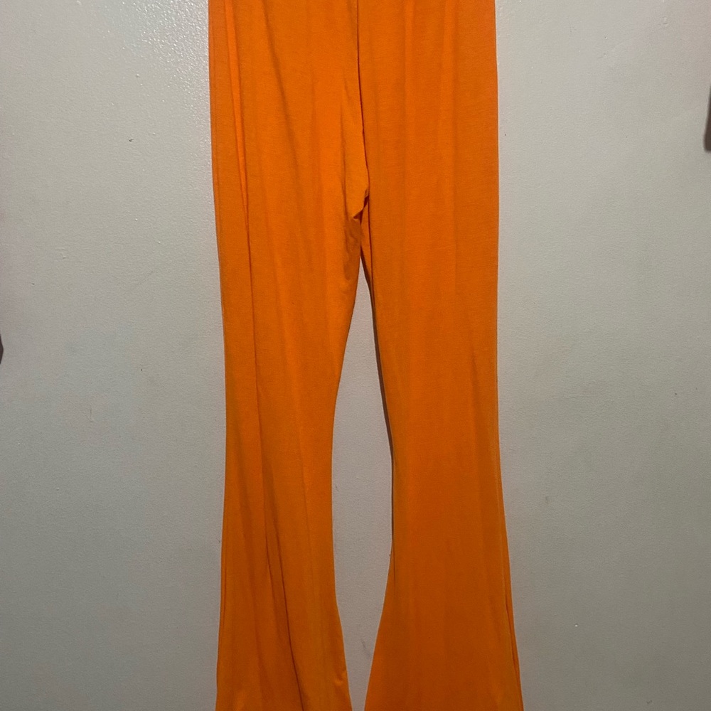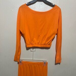 Orange set crop top hangs of shoulder. Pants are stretchy wide leg and the bottom