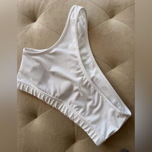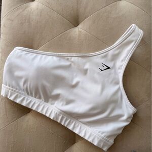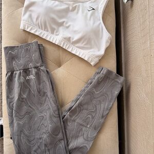 Stylish white sports bra paired with gray patterned leggings. Perfect for workouts.