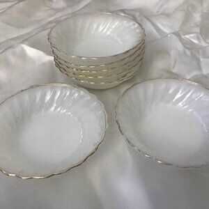 Set 7 Vintage Anchor Hocking 5” White Swirl Milk Glass Fruit Bowl with Gold Trim