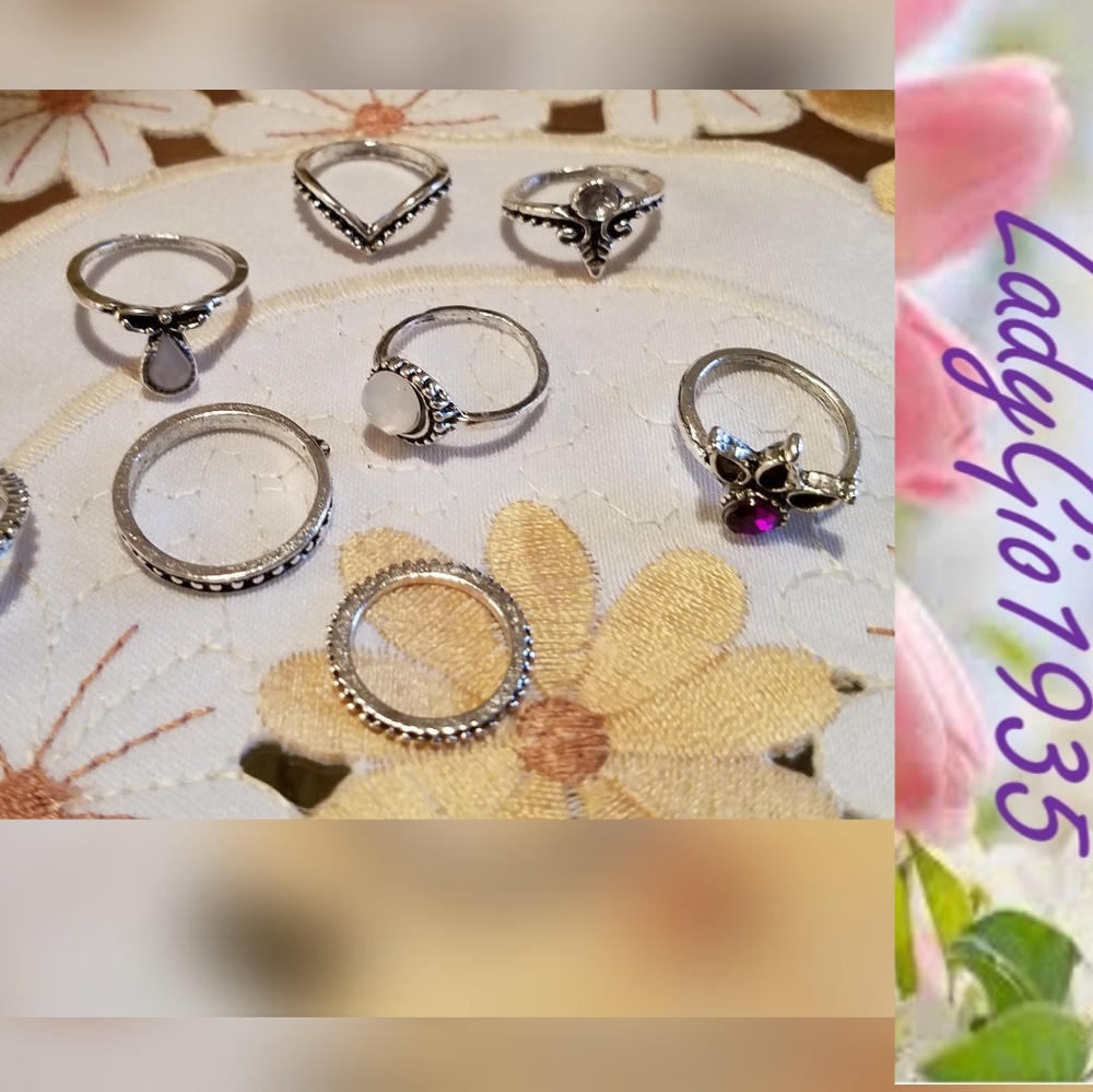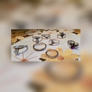 Set of 8 silver accent rings with ivory, clear and purple stones.