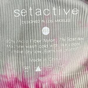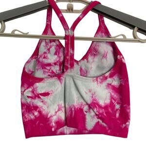 Set an active woman's ribbed bra. And hot pink and light gray tie-dye. Size extra small/small in excellent used condition. Lean flat it measures approximately 10.5 inches unstretched across the chest. And from the top of the shoulder down is 12 inches.