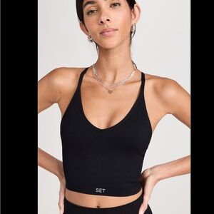 Soft ribbed crop tank in black with a flattering V-neck. Lightweight, stretchy fabric for comfortable everyday wear. Sleek minimalist design with subtle logo at hem. Pairs easily with leggings or lounge pieces for a streamlined look.
