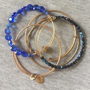 Set of 5 Alex and Ani bracelets. 2 with stones, 2 textured metal, one regular