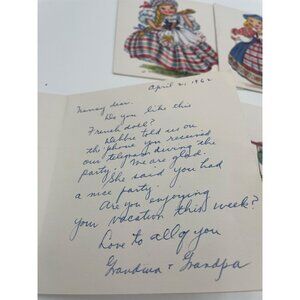 This charming collection of vintage greeting cards features delightful illustrations of international costumes, capturing the essence of various cultures. Accompanied by a handwritten notes from 1962, these cards evoke nostalgia and reflect a bygone era of personal correspondence and artistic expression.