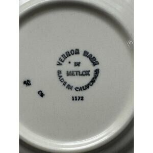 You'll adore this set of Vintage Vernon Ware Metlox Della Robbia cups and saucers with cream and sugar! This charming set, dating back to the 1960s, brings a touch of retro elegance to your table. The design features lovely floral and fruit motifs that are sure to impress your guests and elevate your dining experience. Don't miss out on owning this lovely set!