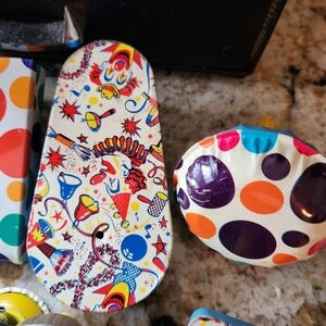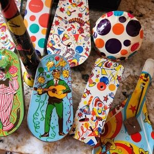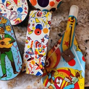 Set of 12 vibrant vintage new years or part tin spinner rachet noise makers with playful designs. Features a mix of colors including red, blue, yellow, and green. Perfect for vintage collector