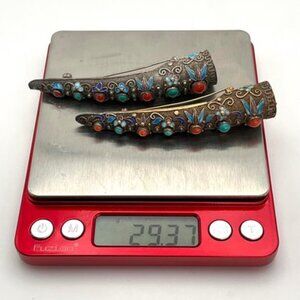 Set Of 2 Antique Chinese Silver Fingernail Guards Pins. Turquoise Coral Stones