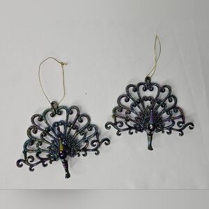 Set Of 2 Blue Purple Iridescent Plastic Peacock Christmas Ornament 4" x 5"