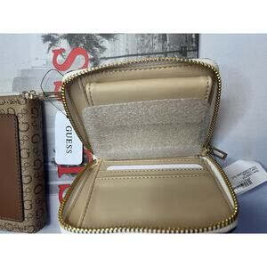 This product is a set of two brand new Guess wallets, one in white with a gold logo and the other in brown with a gold logo. Both wallets are made of faux leather and feature a zip-around style. They are designed for women and include credit card features. These wallets are perfect for those looking for a stylish and functional accessory to complement their outfit.