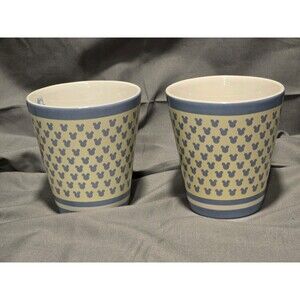 This set of 2 Chef Mickey mugs in pale yellow and blue features a classic round design with a medium capacity of 10-12 oz. Made of stoneware, these mugs are microwave and dishwasher safe, making them convenient for both hot and cold beverages. The mugs are 2 from a set of 4 which showcase the iconic Mickey head patterned like polka dots on the outside of the mug and along the inside you see Mickey Mouse's silhouette, serving up a coffee pot in one and a pot on the other. Perfect for Disney fans and collectors. With a playful design and durable construction, these Chef Mickey mugs are a charming addition to any kitchen or dining area.