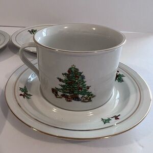 Set Of 2 Christmas Tea Cup And 4 Saucer By Holiday Hostess Christmas Tree Holly