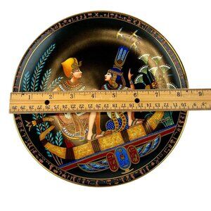 These intricately designed Egyptian collector plates part of the Bradford Exchange "The Legend of Tutankhamen" series feature vibrant hand-painted scenes and hieroglyphic details. First plate is "Tutankhamen & His Princess". Second plate is "The Marriage of Tutankhamen" A striking addition to elevate any display. Made of Osiris Porcelain, giving them the striking black background. In excellent pre-owned condition. No cracks, repairs, crazing or repairs.
