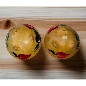 This set of 2 footed Talavera Mexican pottery salsa bowls is a beautiful and unique addition to any collection. Handmade in Mexico, these bowls showcase traditional Mexican culture with their painted chili design. The Talavera pottery is known for its high-quality ceramic products, making these salsa bowls a functional and decorative piece for your table setting or display. The footed design adds an elegant touch to these authentic pieces from Mexico. There is some de-glazing on the bottom of one of the bowls, but it does not detract from these beautiful pieces. Each bowl is about 1.5” tall and almost 4.5” round. Each piece is painted in a vibrant yellow color with colorful hand painted chilis.