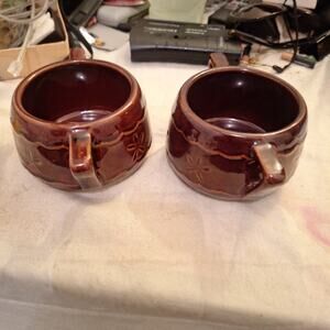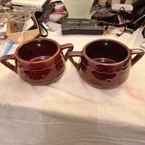 This set of 2 Marcrest brown stoneware sugar bowls features a star design, perfect for farmhouse decor. Made in the USA during the Mid 20th Century, these round bowls have a daisy and dot pattern with a glossy finish. Oven-safe and decorative, these vintage pieces are a charming addition for any adult's kitchen or dining area. The Marcrest Pottery brand ensures quality craftsmanship and a unique style that will complement various occasions.